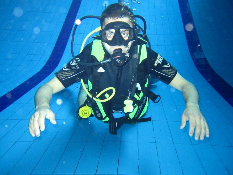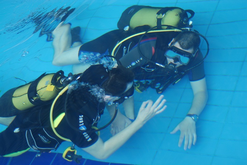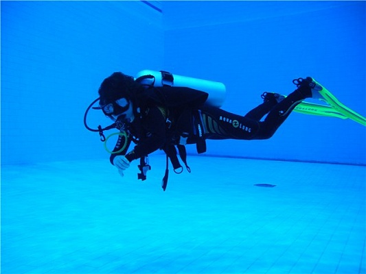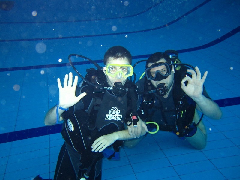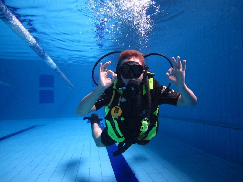 По прибытию в бассейн вы знакомитесь с инструктором, переодеваетесь и принимаете душ. Затем инструктор подбирает подходящее вам по размеру снаряжение и проводит инструктаж по технике безопасности. Вы проходите адаптацию к нахождению в воде на мелководье, пробуете плавать с аквалангом на поверхности воды, обучаетесь системе дыхания и водным опознавательным знакам и только потом погружаетесь вместе с инструктором на глубину бассейна.